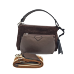 The interior of the bag is lined with quality textile fabric containing a leather pocket with three slots for credit cards on one side and a zippered pocket on the other side. As pictured this handbag features an additional detachable two-toned textile and leather strap that is adjustable, allowing the bag to be worn either as a crossbody or shoulder bag.